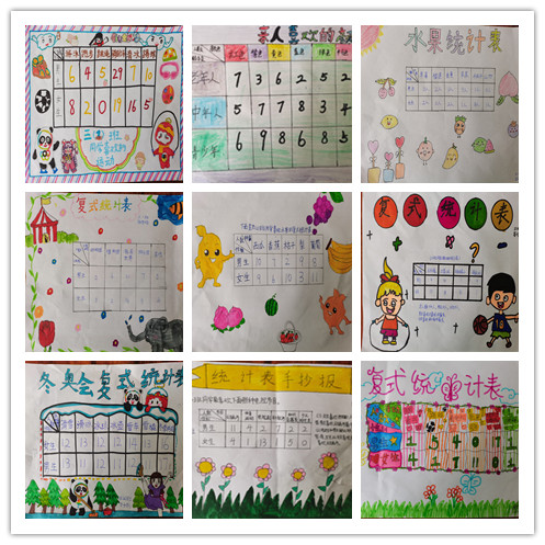 斐斯泰洛齊說(shuō)過(guò):“教學(xué)的主要任務(wù)不是積累知識(shí),而是發(fā)展思維。學(xué)生的學(xué)習(xí)應(yīng)當(dāng)是一個(gè)生動(dòng)活潑的、主動(dòng)的和富有個(gè)性的過(guò)程。”因此我們?nèi)昙?jí)數(shù)學(xué)組的老師們?cè)凇稄?fù)式統(tǒng)計(jì)表》這一單元學(xué)習(xí)結(jié)束后,帶領(lǐng)同學(xué)們開(kāi)展了設(shè)計(jì)創(chuàng)意統(tǒng)計(jì)表的活動(dòng)。