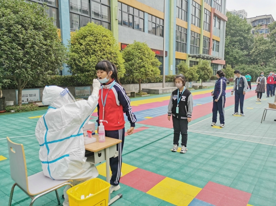 9點,全校師生開始有序進行核酸檢測,經(jīng)歷過多輪核酸檢測后,學(xué)生們也越來越配合防疫人員的工作,張開嘴巴,大聲喊“啊”,整個檢測過程快速有序。