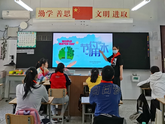 少先隊(duì)活動(dòng)課上,各班級(jí)召開了節(jié)約用水主題隊(duì)會(huì)。從“我國是個(gè)缺水的國家”“節(jié)約用水的方法”“生活中的各個(gè)環(huán)節(jié)節(jié)水”三個(gè)方面向同學(xué)們進(jìn)行了詳細(xì)講解,教育學(xué)生從小要節(jié)約用水。