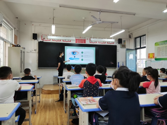 活動(dòng)中,中隊(duì)輔導(dǎo)員從良好的護(hù)眼習(xí)慣、合理的營(yíng)養(yǎng)膳食、充足的質(zhì)量睡眠、做好近視的保健等四個(gè)方面對(duì)學(xué)生進(jìn)行預(yù)防近視的健康教育。通過用眼進(jìn)課堂,學(xué)生明白了:讀寫時(shí),一定要做到“三個(gè)一”,走路乘車時(shí),不看書,不在光線過強(qiáng)或過暗的地方看書等,養(yǎng)成良好的用眼習(xí)慣。多吃有益的蔬菜、水果有助于眼睛的保護(hù)……為保護(hù)學(xué)生視力,各中隊(duì)還會(huì)在課間時(shí)組織隊(duì)員做眼保健操,幫助學(xué)生緩解用眼疲勞。