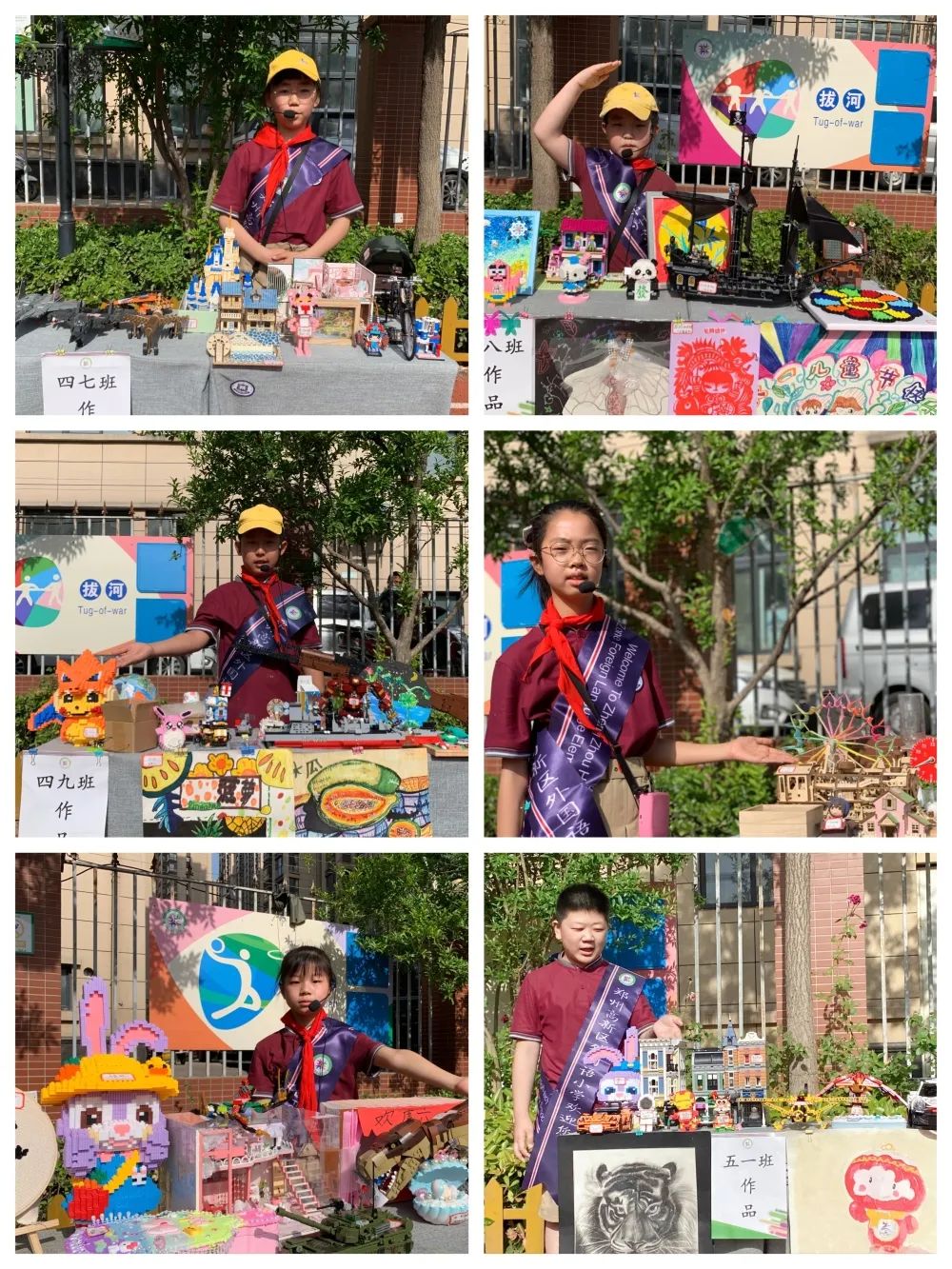 每個(gè)班級都布置了自己的“攤位”,要將班級所有學(xué)生的出彩成果“擺攤兒”展示。或創(chuàng)意發(fā)明,或精美手工,或傳統(tǒng)技藝,或優(yōu)秀作業(yè),或翰墨書法,或繪本創(chuàng)編……,每個(gè)出彩果兒都使出了自己的“看家本領(lǐng)”,每個(gè)班級都派出了“接待團(tuán)”、“講解團(tuán)”,向路過自己“攤位”的老師和同學(xué)展示自己班級學(xué)生的風(fēng)采。在展示中肯定自我、相互認(rèn)同,在交流中增長見識、啟迪智慧。