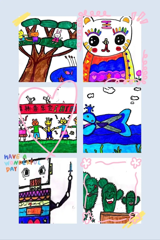 美術(shù)學(xué)科的評(píng)價(jià)主題為《動(dòng)物唱歌的模樣》和《有趣的動(dòng)漫形象》。小嫩芽們根據(jù)題目及繪畫要求,自由大膽地進(jìn)行創(chuàng)作,他們的作品構(gòu)思新穎,想象豐富,色彩飽滿,線條流暢,畫面妙趣橫生。接下來(lái)一起來(lái)看看小嫩芽們的創(chuàng)作吧!