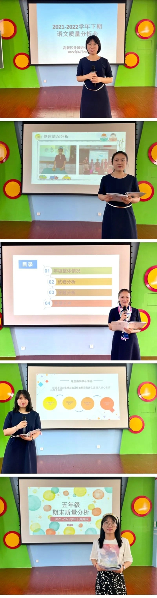 語文組在王新華老師的主持下,各年級教師代表分別對本年級的學(xué)科質(zhì)量,從多角度、多層次進行了深度分析。低學(xué)段教師代表馮路路針對一二年級主題為“嫩芽享雙減,語文展素養(yǎng)”的綜合素能闖關(guān)測評展開了詳盡的介紹;中學(xué)段教師代表萬艷娜和陳若夢對本學(xué)段的總結(jié)性測評情況做了整體梳理,聚焦關(guān)鍵環(huán)節(jié)、結(jié)合日常教學(xué)提出了切實可行的解決措施;高學(xué)段教師代表趙淑佳針對評價改革,聚焦閱讀理解、情境習(xí)作,以及今后教學(xué)中應(yīng)加強的方面提出了建議,對本次測評體系進行了研討剖析,對學(xué)生素養(yǎng)發(fā)展研討出進一步優(yōu)化的方案。