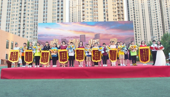 學(xué)生和家長(zhǎng)代表為老師頒獎(jiǎng),為學(xué)校、班主任和任課教師送上錦旗、鮮花和象征永久紀(jì)念的出彩石,表達(dá)無盡的感謝!