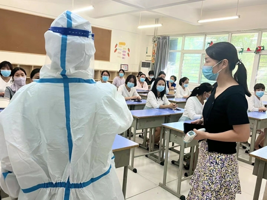 學生有序進入校園后,正副班主任老師在教室門口進行第二次體溫監(jiān)測。上課中如遇到學生不舒服情況,班主任老師第一時間聯(lián)系校醫(yī),由校醫(yī)帶至隔離室進行測溫,聯(lián)系疫情防控人員,立即對密接人員進行轉移,并對教室以及教學樓進行消殺。