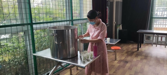 楊宇老師為家長準(zhǔn)備綠豆水