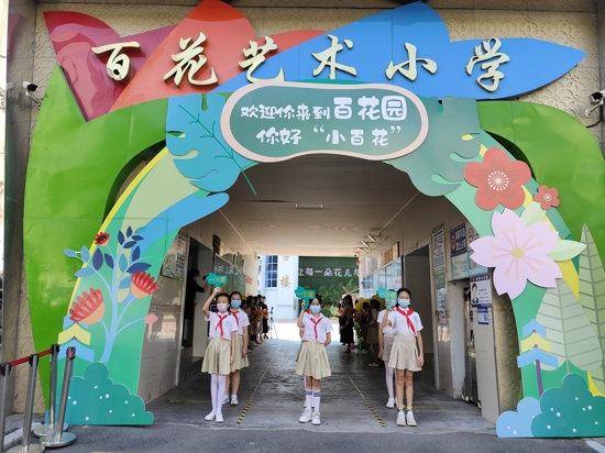 中新網(wǎng)河南9月3日電(吳勇強(qiáng) 王利敏)9月1日下午,鄭州市中原區(qū)百花藝術(shù)小學(xué)舉行了一年一度的新生入學(xué)儀式。校長宮江霞帶領(lǐng)學(xué)校全體行政人員及學(xué)校禮儀隊隊員,在校門口迎接新同學(xué)加入“百花園”的大家庭。
