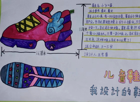 低年級學(xué)生作品“眼睛中的世界”、“我喜歡的植物”,雖筆觸稚嫩但形象生動,大膽地表現(xiàn)了自己個性化的感受,蘊藏著別樣的童真、童趣;中年級同學(xué)用漫畫形式為美術(shù)老師畫了風(fēng)趣的人物頭像,以身邊的物品為題材,一個個毛茸茸的玩具、精美的書包展現(xiàn)在大家眼前;高年級同學(xué)的設(shè)計的“我的鞋子”,畫工精美,圖文并茂,充分體現(xiàn)了藝術(shù)與科學(xué)的完美結(jié)合。