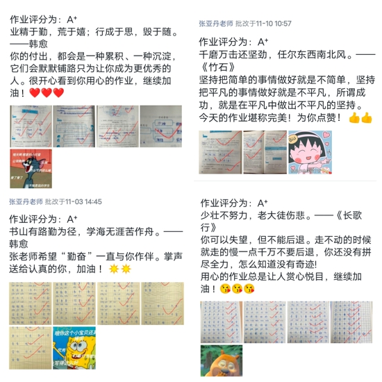 張老師認(rèn)為作業(yè)是與學(xué)生溝通的良好機(jī)會(huì),因此,她每天及時(shí)認(rèn)真批閱每一份作業(yè)。對(duì)于有問(wèn)題的作業(yè)一對(duì)一反饋,對(duì)優(yōu)秀作業(yè)不吝嗇鼓勵(lì),對(duì)進(jìn)步明顯的學(xué)生給予充分肯定。為了充分發(fā)揮作業(yè)的評(píng)價(jià)育人功能,她創(chuàng)新作業(yè)評(píng)語(yǔ),或使用學(xué)生感興趣的表情包,“你是最棒的仔”“你的作業(yè)自帶光環(huán)”;或是送給學(xué)生一句充滿哲理的詩(shī)句,“書(shū)山有路勤為徑,學(xué)海無(wú)涯苦作舟。”“少壯不努力,老大徒傷悲。”又或是精心制作電子獎(jiǎng)狀頒發(fā)給作業(yè)優(yōu)秀的學(xué)生,以此給予學(xué)生充分的成就感和滿滿的儀式感,勉勵(lì)學(xué)生勤奮努力、積極進(jìn)取。