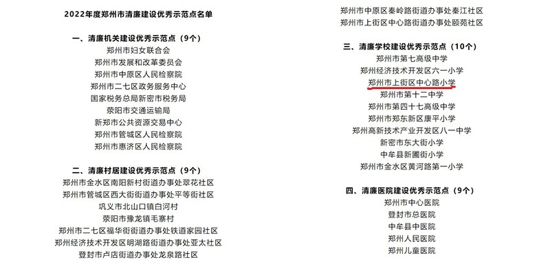 中新河南網(wǎng)12月14日電(吳勇強(qiáng) 李鵬圖)近日,鄭州市紀(jì)委監(jiān)委公布了2022年度鄭州市清廉建設(shè)優(yōu)秀示范點(diǎn)獲評(píng)單位名單,上街區(qū)中心路小學(xué)榜上有名!