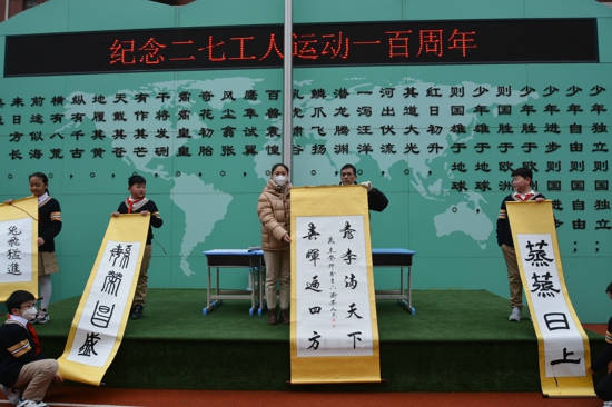 書畫一脈,傳承千古,淵遠流芳;大師手筆,一朝揮灑,萬古流傳。學校在開學典禮上特意邀請河南省人大書畫研究院理事安為民老師,為同學們送上新學期的新驚喜、新祝福。安老師帶領學校趙呂之言、王子豪、王子赫三位小書法家現(xiàn)場揮毫潑墨,為學校送上最真摯的祝福。中國傳統(tǒng)書法文化的薪火交接,不僅是文化的傳承,是精神的傳承,更是老一輩對新一代溫暖的傳承。