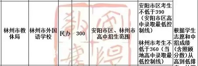 2023年未被高中學(xué)校錄取且中招成績(jī)?cè)谧畹屯稒n線(見(jiàn)附表)以上安陽(yáng)市區(qū)、安陽(yáng)縣(含殷都區(qū))390分、林州市高中招生范圍內(nèi)的考生360分。