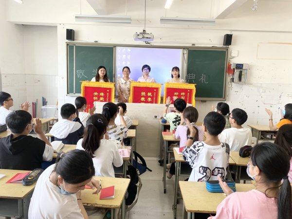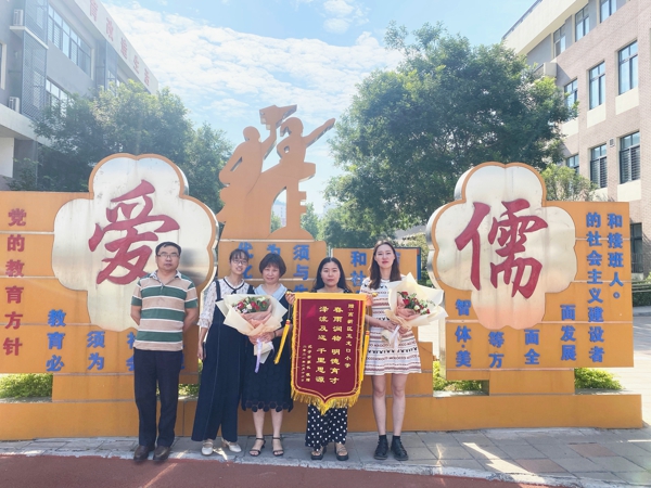 錦旗,代表著榮譽,是對老師最高的褒獎;代表著認可,是對學校最大的肯定。散學典禮這天,三位家長代表將印著“桃李滿天下授教固有方”“春雨潤物明德育才澤流及遠千里思源”“疼愛無微不至關懷教導有方”“好習慣陪伴終生好老師影響一生”燙金大字的錦旗送到學校,以此表達對學校、對任課老師關愛孩子、無私奉獻的感激之情,一股暖意涌上心頭。兩個班的任課老師對家長們表示感謝并合影留念。