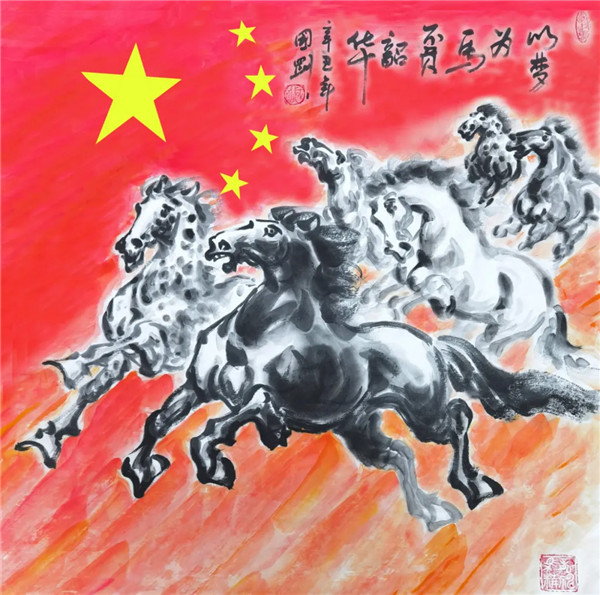 2018年10月,國畫《新時(shí)代新征程》《壯志凌云》被中國華僑歷史博物館永久收藏。中國人喜歡龍馬精神、求財(cái)祈福,朱砂畫民間有驅(qū)邪祈福之美傳,尤其近期用朱砂創(chuàng)作的《馬上有!贰陡T谘矍啊贰洱堮R送福》《四季財(cái)馬》等作品,深受人們的喜愛,被譽(yù)為“華夏第一福馬”。