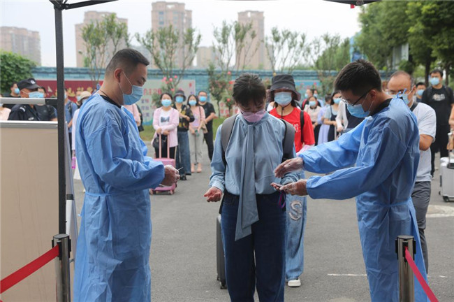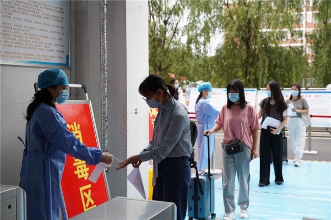 在學(xué)校南大門,防疫工作人員恪盡職守,入校流程規(guī)范嚴(yán)謹(jǐn)。學(xué)生持學(xué)生證或校園一卡通進(jìn)行身份核驗(yàn),出示通信形成大數(shù)據(jù)卡、防疫健康信息碼和48小時(shí)內(nèi)核酸檢測陰性證明,進(jìn)行測溫以及行李、腳底和手消毒,更換口罩后進(jìn)入校園。