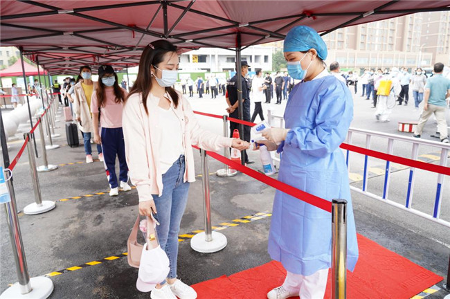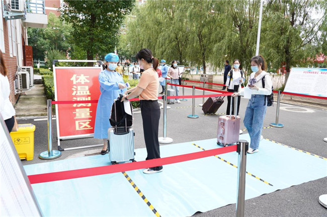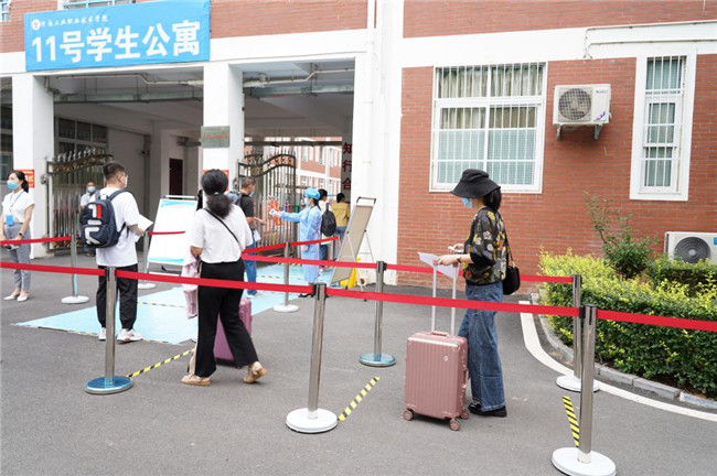 在學(xué)生公寓,學(xué)生進(jìn)入公寓的流程及注意事項(xiàng)等展板迎面可見,學(xué)生陸續(xù)報(bào)到入住,工作人員在學(xué)生公寓入口處查驗(yàn)學(xué)生身份及健康碼,完成體溫檢測、殺菌消毒等程序后,學(xué)生保持1米間距有序進(jìn)入公寓。