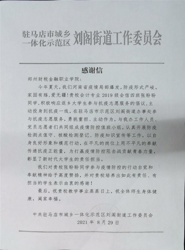 8月29日,中共駐馬店市城鄉(xiāng)一體化示范區(qū)劉閣街道工作委員會(huì)向該院發(fā)來感謝信,誠摯感謝19級(jí)會(huì)計(jì)信息管理4班張盼盼同學(xué)在疫情發(fā)生的第一時(shí)間投入到大學(xué)生志愿服務(wù)行動(dòng)中,勇于擔(dān)當(dāng)、主動(dòng)作為,在平凡的崗位上用不平凡的奉獻(xiàn)傳遞正能量。