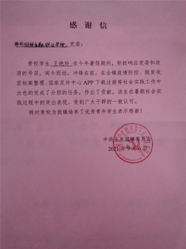 9月6日,中共鹿邑縣王皮溜鎮(zhèn)委員會(huì)向該院發(fā)來感謝信,誠摯感謝會(huì)計(jì)學(xué)院19級(jí)財(cái)務(wù)管理4班王艷玲同學(xué)在暑假期間在全鎮(zhèn)疫情防控、脫貧攻堅(jiān)、國家反詐中心APP下載注冊(cè)等工作中做出的突出貢獻(xiàn)。