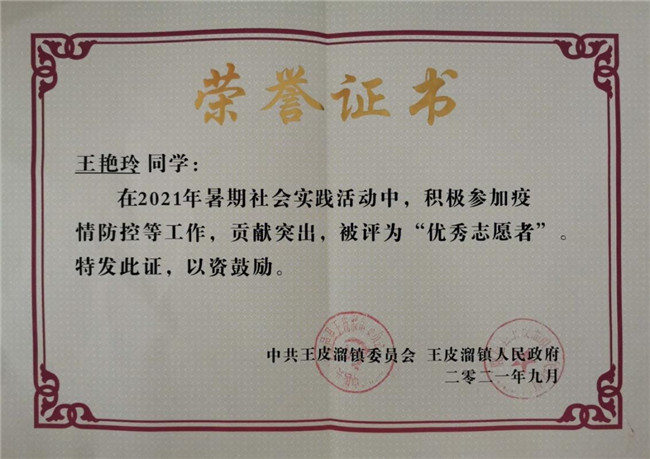 王艷玲同學(xué)在志愿服務(wù)工作期間,開展返鄉(xiāng)人員信息登記、收取核酸檢測(cè)報(bào)告以及宣傳疫情防控相關(guān)知識(shí)等工作。同時(shí),為了響應(yīng)國家號(hào)召她組織每村每戶下載注冊(cè)“國家反詐中心”APP,得到了鎮(zhèn)書記和值班領(lǐng)導(dǎo)的一致好評(píng),并被中共鹿邑縣王皮溜鎮(zhèn)委員會(huì) 王皮溜鎮(zhèn)人民政府評(píng)為“優(yōu)秀志愿者”。