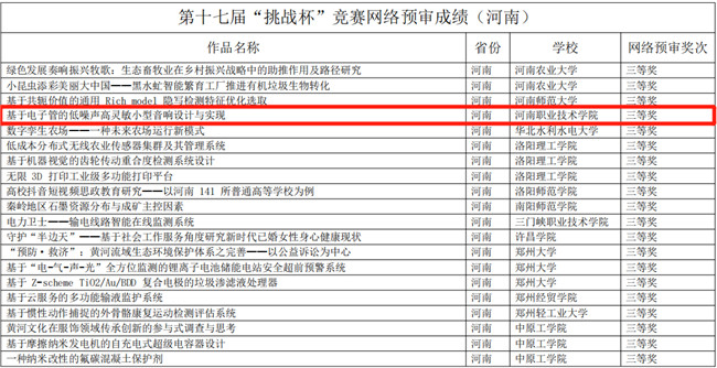 中新河南網(wǎng)9月16日電(魏豪 靳兵)近日,由共青團中央、中國科協(xié)、教育部和全國學(xué)聯(lián)共同主辦的第十七屆“挑戰(zhàn)杯”大學(xué)生課外學(xué)術(shù)科技作品競賽網(wǎng)絡(luò)預(yù)審成績揭曉,河南職業(yè)技術(shù)學(xué)院電氣工程學(xué)院參賽作品《基于電子管的低噪聲高靈敏小型音響設(shè)計與實現(xiàn)》榮獲全國三等獎(河南省?圃盒H兩項),實現(xiàn)了該校在“挑戰(zhàn)杯”科技類競賽全國賽中零的突破,為該校的“雙高”校建設(shè)又添一項標(biāo)志性成果。