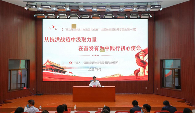 中新河南網(wǎng)9月28日電(朱潔)為深入貫徹全面落實《關(guān)于新時代加強和改進思想政治工作的意見》,不斷深入推進“把災(zāi)難當教材 與祖國共成長”主題教育活動,9月26日,鄭州經(jīng)貿(mào)學(xué)院黨委書記趙榴明以“從抗洪戰(zhàn)疫中汲取力量 在奮發(fā)有為中踐行初心使命”為題,從“汲取力量,把心中的‘國’”字擦得更亮”、“勇?lián)姑,把肩上?lsquo;責(zé)’字刻得更深”、“弘揚精神,把眼前的‘學(xué)’字看得更重”三個方面為返校教職工講開學(xué)“思政第一課”。
