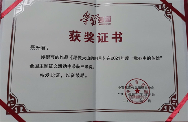 中新河南網(wǎng)1月25日電 近日,“學(xué)習(xí)強(qiáng)國”學(xué)習(xí)平臺舉辦的“我心中的英雄”主題征文活動獲獎名單公布,濮陽職業(yè)技術(shù)學(xué)院體育健康學(xué)院2019級學(xué)生聶升君的作品《愿做大山的明月》獲三等獎。