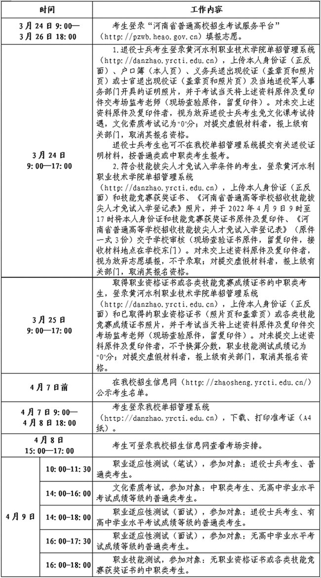 符合上述技能拔尖人才免試入學(xué)條件的考生,須于2022年3月24日9時(shí)至17時(shí),登錄黃河水利職業(yè)技術(shù)學(xué)院?jiǎn)握泄芾硐到y(tǒng)(http://danzhao.yrcti.edu.cn),上傳本人身份證(正反面)和技能競(jìng)賽獲獎(jiǎng)證書、《河南省普通高等學(xué)校招收技能拔尖人才免試入學(xué)登記表》照片,并于2022年4月9日9時(shí)至17時(shí)將本人身份證和技能競(jìng)賽獲獎(jiǎng)證書原件及復(fù)印件、《河南省普通高等學(xué)校招收技能拔尖人才免試入學(xué)登記表》(原件一式3份)交予學(xué)校審核(現(xiàn)場(chǎng)查驗(yàn)證書原件,留復(fù)印件,接收材料地點(diǎn)在學(xué)校東門)。對(duì)未交上述資料原件及復(fù)印件者,視為放棄志愿填報(bào),不予錄取;對(duì)提交虛假材料者,報(bào)上級(jí)有關(guān)部門,取消其報(bào)名資格。