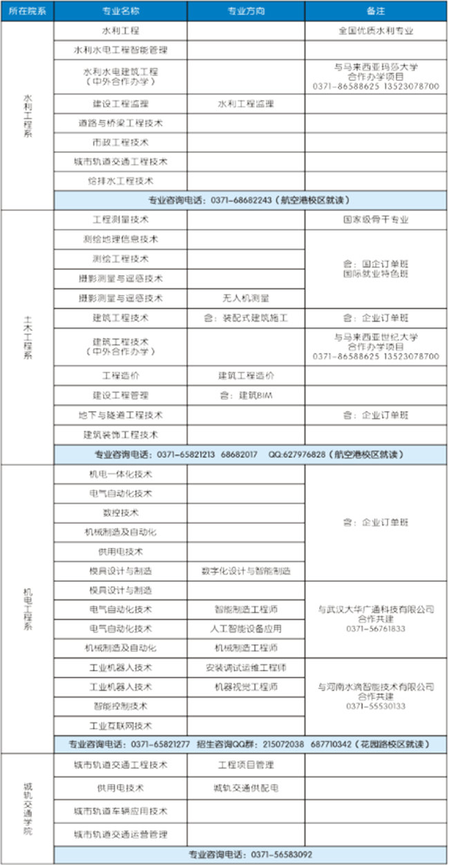 專業(yè)布局合理。學校設(shè)有水利工程系、土木工程系、機電工程系、信息工程系、經(jīng)濟管理系、環(huán)境工程系、城軌交通學院,開設(shè)有水利、土木建筑、資源環(huán)境與安全、裝備制造、電子與信息、財經(jīng)商貿(mào)、交通運輸、能源動力與材料、文化藝術(shù)9大類56個專業(yè)和29個專業(yè)方向,其中水利水電建筑工程、工程測量技術(shù)專業(yè)為國家級骨干專業(yè),建筑工程技術(shù)、計算機應(yīng)用技術(shù)、環(huán)境工程技術(shù)專業(yè)為河南省骨干專業(yè),水利工程專業(yè)為全國優(yōu)質(zhì)水利專業(yè)。