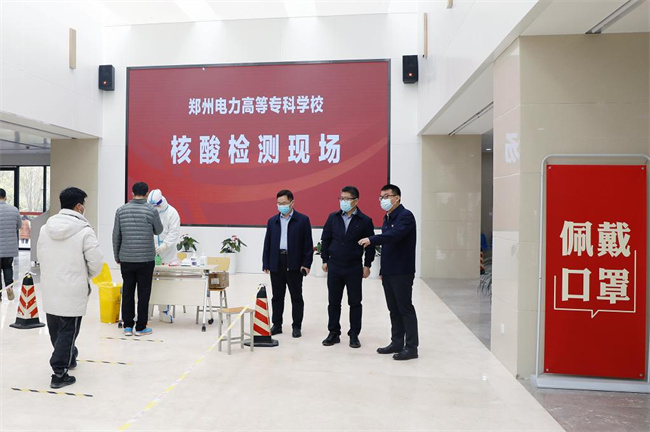 鄭州電力高專領(lǐng)導(dǎo)實(shí)地查看采樣流程、秩序維護(hù)、防控措施落實(shí)等情況,詳細(xì)了解采樣點(diǎn)區(qū)域劃分、現(xiàn)場(chǎng)組織、采樣進(jìn)度、物資配備等情況,對(duì)參與核酸檢測(cè)醫(yī)務(wù)人員等工作人員的辛苦付出表示誠(chéng)摯感謝和敬意。
