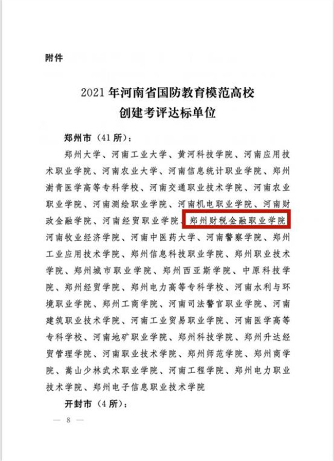 鄭州財(cái)稅金融職業(yè)學(xué)院被評為2021年河南省國防教育模范高校創(chuàng)建考評達(dá)標(biāo)單位