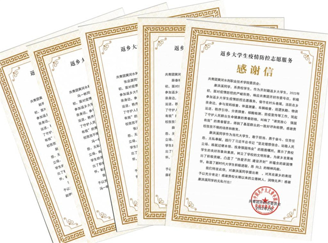 中新河南網(wǎng)4月7日電 2022年初,我省面臨新冠疫情防控形勢嚴峻復(fù)雜,防控工作進入膠著對壘的關(guān)鍵時刻。為應(yīng)對嚴峻形勢,充分發(fā)揮青年學(xué)生的生力軍和突擊隊作用,黃河水利職業(yè)技術(shù)學(xué)院團委積極引導(dǎo)團員青年向居住地社區(qū)(村)報到,在做好自身安全防護的前提下,依法科學(xué)有序參加疫情防控志愿服務(wù)工作。近日,黃河水利職業(yè)技術(shù)學(xué)院收到共青團開封市委員會、五陵鎮(zhèn)人民政府、泌陽縣馬谷田鎮(zhèn)人民政府等發(fā)來的感謝信,對黃河水利職業(yè)技術(shù)學(xué)院返鄉(xiāng)大學(xué)生疫情防控志愿者給與鼓勵和肯定。