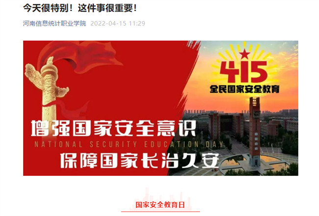 據悉,全民國家安全教育日(National Security Education Day)是為了增強全民國家安全意識,維護國家安全而設立的節(jié)日。2015年7月1日,全國人大常委會通過的《中華人民共和國國家安全法》第十四條規(guī)定,每年4月15日為全民國家安全教育日。2022年4月15日是第七個全民國家安全教育日;顒又黝}為"樹牢總體國家安全觀,感悟新時代國家安全成就,為迎接黨的二十大勝利召開營造良好氛圍"。