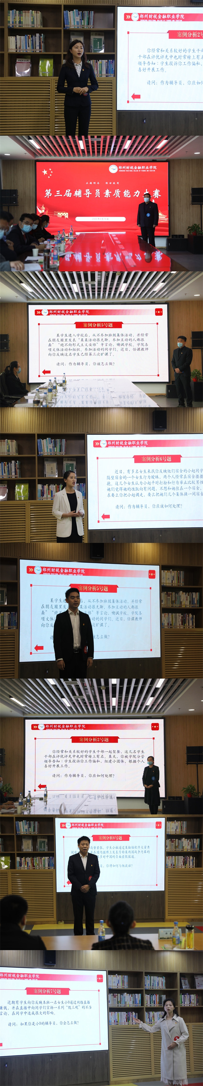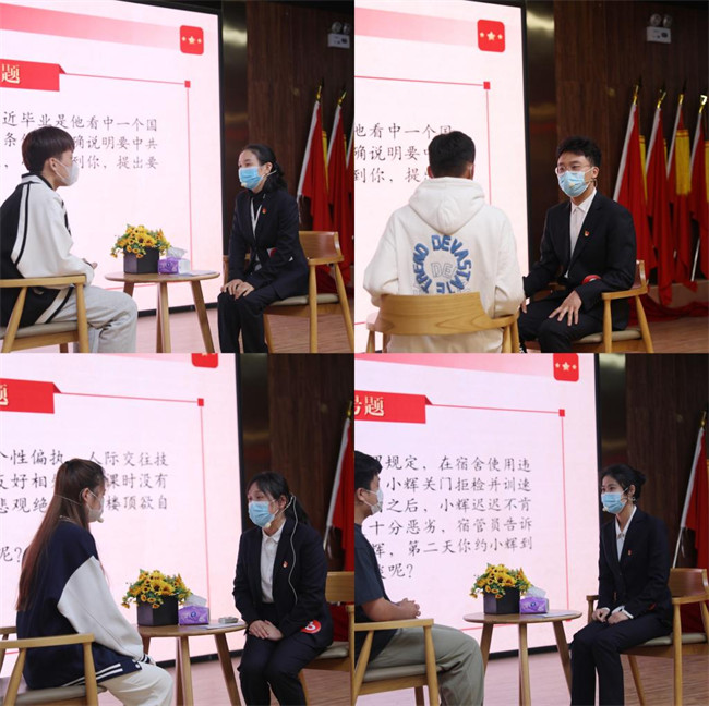 本次大賽按照教育部辦公廳《關于舉辦第九屆全國輔導員素質能力大賽的通知》中的賽制安排,分為基礎知識測試、案例研討、談心談話三個環(huán)節(jié);A知識測試于4月15日下午在厚德樓二樓會議室采用閉卷作答方式開展,重點考察輔導員的理論素養(yǎng)和業(yè)務知識;案例研討于4月16日上午在圖書館分為A、B考場進行,主要考察輔導員綜合運用理論分析問題、研判問題、解決問題、應急處理等能力;經過以上兩項比賽的選拔,共有11名輔導員入圍決賽。