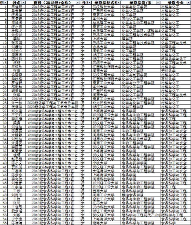 今年化工食品學(xué)院考研結(jié)果呈現(xiàn)出如下特點(diǎn):一是該院共有260名本科畢業(yè)生,其中201人報名參加考試,92人通過國家線,上線率45.77%,85人被錄取,錄取率42.29%,再創(chuàng)新高;二是錄取院校質(zhì)量顯著提高,例如吉林大學(xué)、西南大學(xué)、河北工業(yè)大學(xué)、合肥工業(yè)大學(xué)、太原理工大學(xué)、上海大學(xué)、鄭州大學(xué)、石河子大學(xué)、東北林業(yè)大學(xué)、廣西大學(xué)、河南大學(xué)等國內(nèi)高水平院校錄取人數(shù)和比率均有大幅提高;三是涌現(xiàn)出2266、2246、1367等數(shù)個學(xué)霸宿舍和一個學(xué)霸班級——2020級食品科學(xué)與工程(專升本)一班28人報名參加考試,18人過線,15人被錄取,錄取率53.57%,學(xué)習(xí)氛圍更加濃厚。