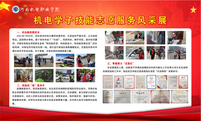 “機(jī)電學(xué)子技能志愿服務(wù)風(fēng)采展”集中展示了7·20鄭州及周邊地區(qū)特大暴雨期間,河南機(jī)電職業(yè)學(xué)院青年學(xué)子積極響應(yīng)黨和政府以及學(xué)校的號(hào)召,主動(dòng)請(qǐng)纓,利用所學(xué)技術(shù)技能,發(fā)揚(yáng)“特別能吃苦、特別能戰(zhàn)斗、特別能克難攻堅(jiān)”的機(jī)電精神,沖鋒在防汛抗疫的第一線的先進(jìn)事跡。他們逆行奔波的身影熠熠發(fā)光,在勇?lián)L(fēng)雨中盡展機(jī)電學(xué)子聽(tīng)黨召喚、甘于奉獻(xiàn)、沖鋒在前的磅礴青春力量!