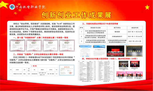 “創(chuàng)新創(chuàng)業(yè)工作成果展”主要展示了學(xué)校創(chuàng)新創(chuàng)業(yè)做法以及優(yōu)秀成果。學(xué)校以“創(chuàng)業(yè)帶領(lǐng)、項(xiàng)目驅(qū)動(dòng)”為發(fā)展戰(zhàn)略,實(shí)施“6+N”創(chuàng)新創(chuàng)業(yè)工作方案,通過(guò)構(gòu)建創(chuàng)新創(chuàng)業(yè)人才培養(yǎng)培訓(xùn)育人體系,建設(shè)創(chuàng)新創(chuàng)業(yè)師資隊(duì)伍,搭建創(chuàng)新創(chuàng)業(yè)數(shù)字化平臺(tái),打造產(chǎn)教融合創(chuàng)新創(chuàng)業(yè)示范基地,組建創(chuàng)新創(chuàng)業(yè)公司,設(shè)立創(chuàng)業(yè)資金,培育多個(gè)創(chuàng)新創(chuàng)業(yè)項(xiàng)目,榮獲第十屆“中國(guó)軟件杯”大賽(科技創(chuàng)新比賽)一等獎(jiǎng)、河南省“互聯(lián)網(wǎng)+”大學(xué)生創(chuàng)新創(chuàng)業(yè)大賽一等獎(jiǎng)、2020屆全國(guó)普通高校畢業(yè)生就業(yè)創(chuàng)業(yè)工作典型案例、河南省首批深化創(chuàng)新創(chuàng)業(yè)教育改革示范高校(職業(yè)教育)等多項(xiàng)榮譽(yù)稱號(hào),激勵(lì)師生大膽進(jìn)行創(chuàng)新創(chuàng)業(yè),促進(jìn)學(xué)生全面發(fā)展,推動(dòng)落實(shí)以創(chuàng)新創(chuàng)業(yè)為引領(lǐng)的線場(chǎng)模式,助力學(xué)校高質(zhì)量發(fā)展。