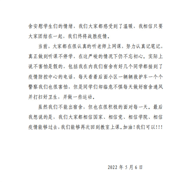 當(dāng)深夜降臨,月亮升起,宿舍一盞盞等漸次熄滅,校園又如往昔沉靜下來(lái),看到一名學(xué)生發(fā)來(lái)的感言,還有綜合樓宿舍學(xué)生的一幅漫畫(huà),我們一掃一天的勞累,內(nèi)心深處涌現(xiàn)出絲絲暖意。我們堅(jiān)信,在學(xué)院黨委的堅(jiān)強(qiáng)領(lǐng)導(dǎo)下,全體教職員工將以舍我其誰(shuí)的決心和勇?lián)厝蔚淖黠L(fēng),將更迅速更規(guī)范更精準(zhǔn)落實(shí)校園管理、核酸檢測(cè)、學(xué)生思想教育等各項(xiàng)工作,一定能夠堅(jiān)決阻斷校內(nèi)校外疫情傳播鏈,全力以赴打贏疫情防控阻擊戰(zhàn)。