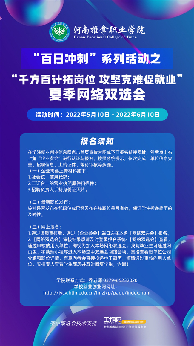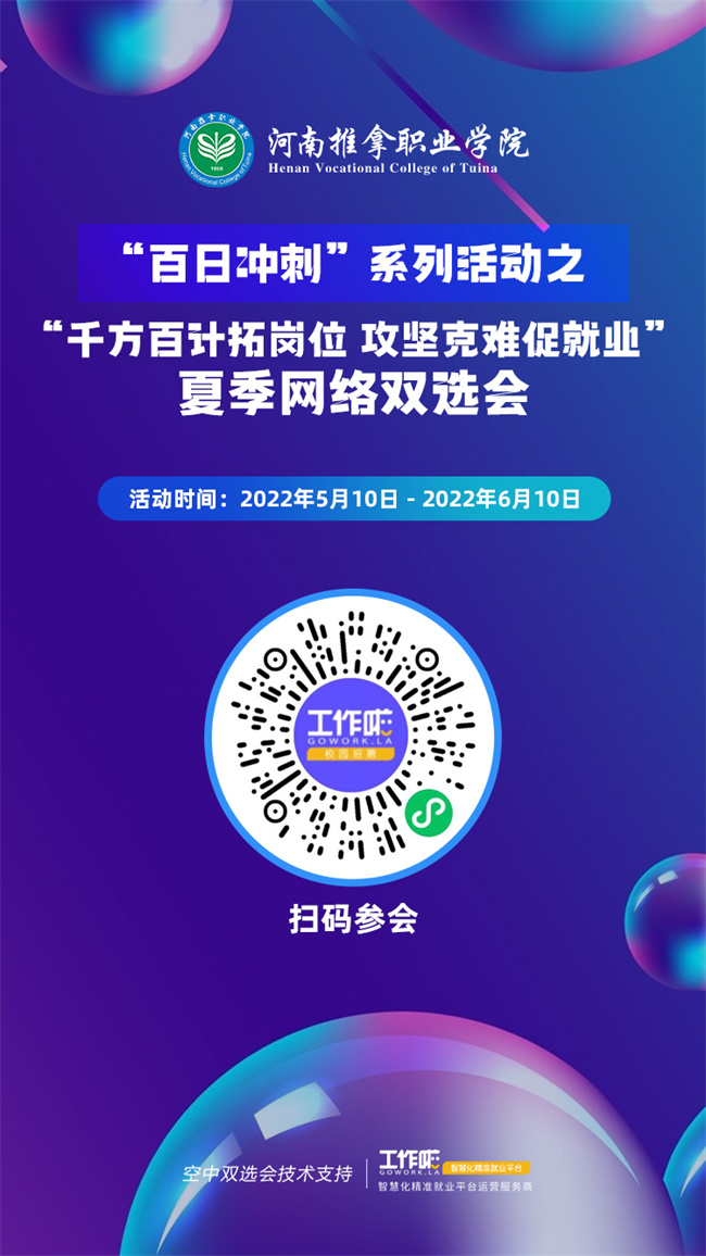 真誠感謝貴單位長期以來對我院畢業(yè)生的厚愛和對我院就業(yè)工作的大力支持!為貫徹落實(shí)黨中央、國務(wù)院“穩(wěn)就業(yè)”“保就業(yè)”決策部署,根據(jù)國家關(guān)于新型冠狀病毒防疫期間的要求,結(jié)合我院疫情防控期間校園招聘工作安排,為全力保障用人單位招聘和畢業(yè)生求職的需求,我院定于2022年5月10日-6月10日舉辦“百日沖刺”系列活動之“千方百計拓崗位 攻堅克難促就業(yè)”河南推拿職業(yè)學(xué)院夏季網(wǎng)絡(luò)雙選會,誠摯邀請貴單位參加,具體事宜如下: