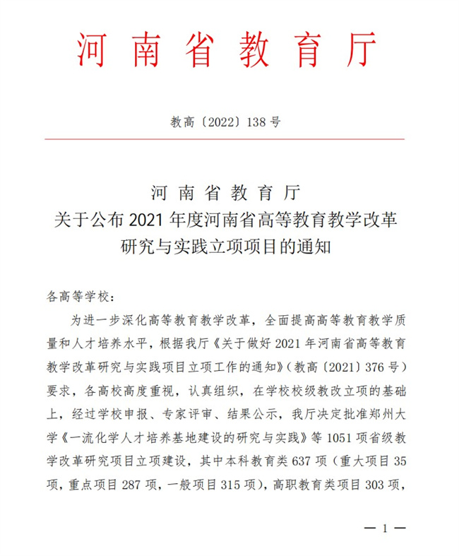 中新河南網(wǎng)5月13日電(崔源) 近日,河南省教育廳發(fā)布了《關(guān)于公布2021年度河南省高等教育教學(xué)改革研究與實(shí)踐立項(xiàng)項(xiàng)目的通知》(教高〔2022〕138號(hào)),河南交通職業(yè)技術(shù)學(xué)院(簡(jiǎn)稱“河南交院”)主持的8個(gè)項(xiàng)目獲批立項(xiàng),其中重點(diǎn)項(xiàng)目3個(gè),一般項(xiàng)目5個(gè),項(xiàng)目整體質(zhì)量持續(xù)提升。