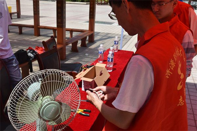 上午9點,濟源職業(yè)技術(shù)學(xué)院的柴永森、張新軍、趙亞飛、苗輝四位老師,帶領(lǐng)“青春紅馬甲”志愿服務(wù)隊6名同學(xué)到濟水苑小區(qū)廣場。隨著小區(qū)物業(yè)管理員和志愿者的宣傳,不久,小區(qū)居民帶著有故障的電風(fēng)扇、微波爐等家用電器陸續(xù)來到活動現(xiàn)場。張新軍老師帶領(lǐng)志愿者認(rèn)真檢查每一件電器存在的問題,一絲不茍地維修故障、排除隱患,對無法修復(fù)的電器,詳細(xì)說明原因。趙亞飛老師耐心地傾聽居民的咨詢,為大家講解“家庭安全用電常識”和“省電小竅門”,并向居民發(fā)放了“家庭安全用電”宣傳單。柴永森老師帶領(lǐng)志愿服務(wù)隊的學(xué)生上門為居民維修,熱情細(xì)致的服務(wù),得到居民的連連好評。