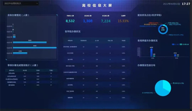 用上了大數(shù)據(jù),管理效果如何?在信息化管理中心信息系統(tǒng)部科,點(diǎn)開(kāi)“新鄉(xiāng)學(xué)院一網(wǎng)通辦服務(wù)大廳”平臺(tái)的離校信息大屏,畢業(yè)生人數(shù)、總完成人數(shù)、未完成人數(shù)、完成率以及各學(xué)院辦理狀況一目了然。
