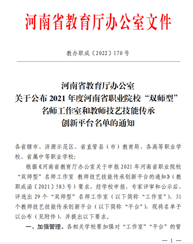 河南省職業(yè)院校教師技藝技能傳承創(chuàng)新平臺建設計劃是省教育廳貫徹落實《教育部財政部關于實施職業(yè)院校教師素質提高計劃(2017-2020年)的意見》等文件精神,面向裝備制造、高新技術、傳統(tǒng)(民族)技藝等緊缺專業(yè),依托全省優(yōu)質職業(yè)院校、應用型高;蚵毥處熧Y培養(yǎng)培訓基地、科技型企業(yè)而進行的建設項目,是全面加強職業(yè)院校“雙師型”教師隊伍建設的重要舉措。
