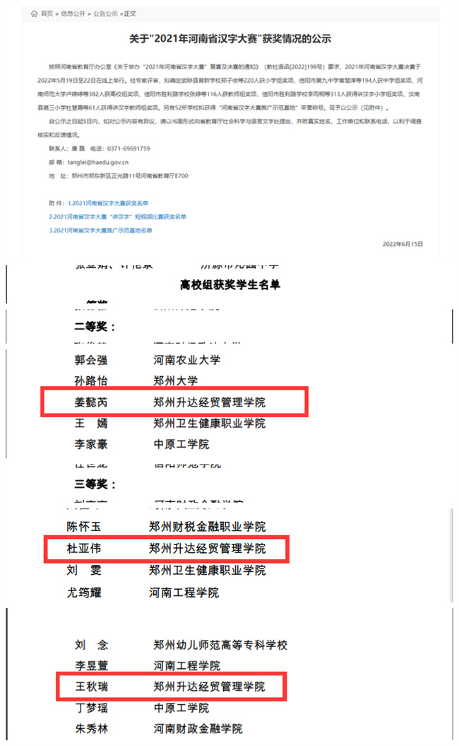 鄭州升達(dá)經(jīng)貿(mào)管理學(xué)院在2021年河南省漢字大賽決賽中喜獲佳績