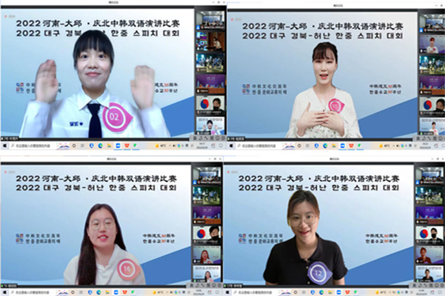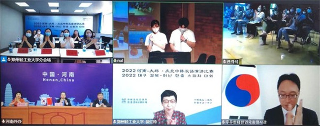 中新河南網(wǎng)6月30日電(夏月亮) 2022年是中韓建交三十周年,也是“中韓文化交流年”。6月24日,由河南省人民政府外事辦公室、中國駐釜山總領事館、河南省教育廳、韓國駐武漢總領事館、韓國大邱廣域市、韓國慶尚北道共同主辦,鄭州輕工業(yè)大學與韓國大邱加圖立大學承辦的2022河南省—韓國大邱慶北地區(qū)漢韓語演講比賽決賽暨頒獎儀式通過線下、線上相結合的方式成功舉辦。中國駐釜山總領事館副總領事涂敬昌、韓國駐武漢總領事館副總領事柳寅植分別為本次大賽致辭。該校國際合作與交流處負責同志應邀出席了本次比賽。