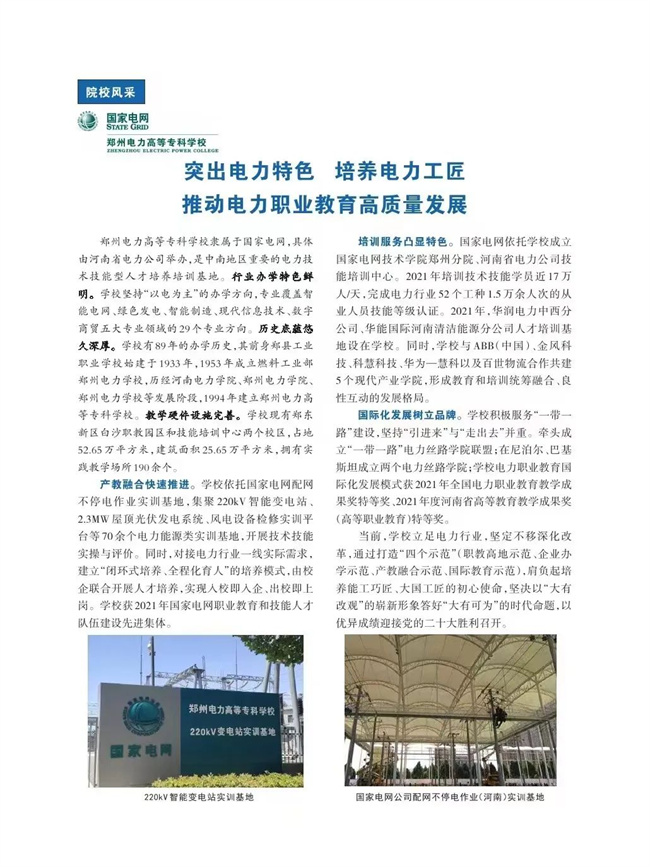 培訓服務凸顯特色。國家電網依托學校成立國家電網技術學院鄭州分院、河南省電力公司技能培訓中心。2021年培訓技術技能學員近17萬人/天,完成電力行業(yè)52個工種1.5萬余人次的從業(yè)人員技能等級認證。2021年,華潤電力中西分公司、華能國際河南清潔能源分公司人才培訓基地設在學校。同時,學校與ABB(中國)、金風科技、科慧科技、華為-慧科以及百世物流合作共建5個現代產業(yè)學院,形成教育和培訓統(tǒng)籌融合、良性互動的發(fā)展格局。