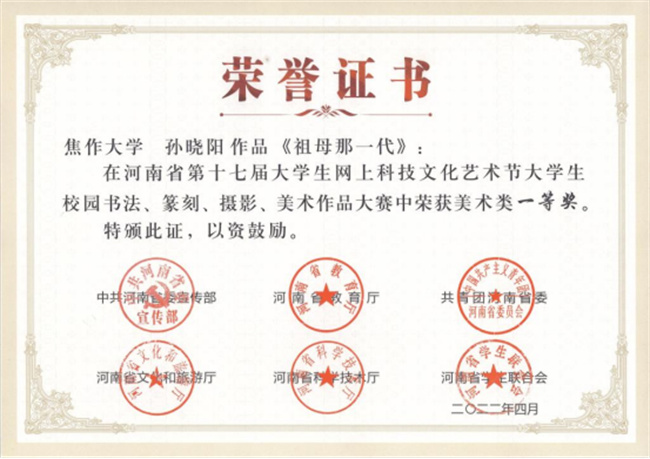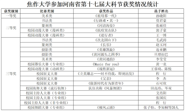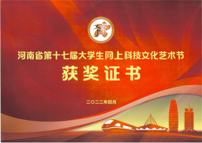 中新河南網(wǎng)7月5日電 近日,中共河南省委宣傳部、河南省教育廳、共青團(tuán)河南省委、河南省文化和旅游廳、河南省科學(xué)技術(shù)廳、河南省學(xué)生聯(lián)合會(huì)聯(lián)合下發(fā)了《關(guān)于發(fā)布河南省第十七屆大學(xué)生網(wǎng)上科技文化藝術(shù)節(jié)獲獎(jiǎng)作品(個(gè)人)和優(yōu)秀組織單位名單的通知》(豫青聯(lián)字〔2022〕9 號(hào)),對(duì)河南省第十七屆大學(xué)生科技文化藝術(shù)節(jié)各項(xiàng)賽事進(jìn)行了表彰,焦作大學(xué)學(xué)生在比賽中喜獲佳績,其中一等獎(jiǎng)1項(xiàng),二等獎(jiǎng)4項(xiàng),三等獎(jiǎng)15項(xiàng)。