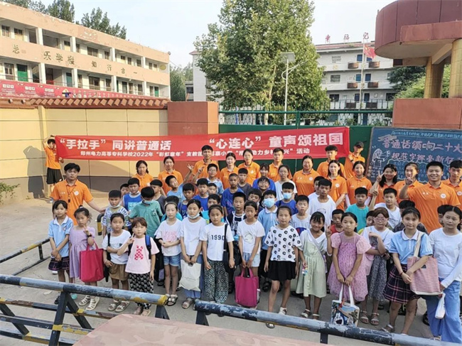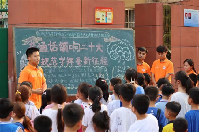 推普隊(duì)員們深入伊川縣當(dāng)?shù)剜徖、校園,通過調(diào)研、發(fā)放問卷等方式,摸清當(dāng)?shù)仄胀ㄔ捚占扒闆r,策劃并開展了13門“普通話誦響二十大 規(guī)范字揮毫新征程”“書香伴成長”、“一墻一文化”、“開展趣味推普 弘揚(yáng)傳統(tǒng)文化”等符合實(shí)際的推普課程,以新揭牌的葛寨小學(xué)“彩虹童年結(jié)對(duì)幫扶智慧教室”為依托,開展了豐富多彩的語言課程。