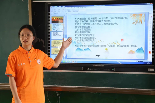 “小朋友們,這就是我們今天學(xué)習(xí)的第一個(gè)詞——中國”。推普隊(duì)員張茹夢(mèng)以“中國”二字導(dǎo)入伊川縣葛寨小學(xué)一年級(jí)的推普課程,她選取了義務(wù)教育階段課文中的經(jīng)典黨史青年史為片段,將紅色故事、國學(xué)經(jīng)典教育融入普通話學(xué)習(xí)教育。他們希望在為實(shí)施鄉(xiāng)村振興發(fā)展戰(zhàn)略營造良好的語言環(huán)境的同時(shí),可以賦予推普課更多的思政元素,強(qiáng)化育人效果。