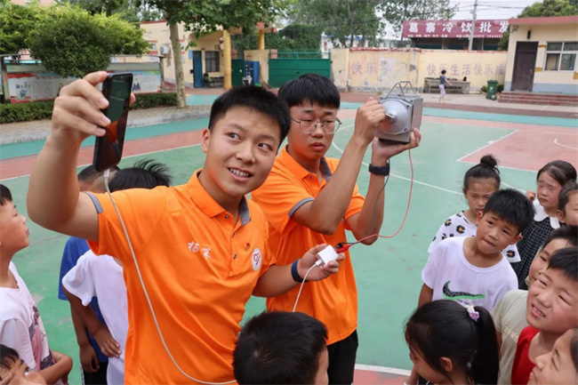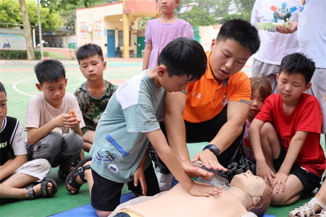 “職業(yè)技能+普通話”培訓(xùn)從娃娃抓起,“電力推普助振興”戶外課堂中,推普隊(duì)員劉芃舉搖動(dòng)著手搖發(fā)電機(jī),手機(jī)出現(xiàn)“正在充電”的界面,小朋友們瞬間一片驚呼,支教隊(duì)員楊深趁機(jī)向小朋友們進(jìn)行應(yīng)急救護(hù)培訓(xùn),通過窒息急救中的胸外按壓方法,以新奇的興趣課堂激起一陣陣聲潮。