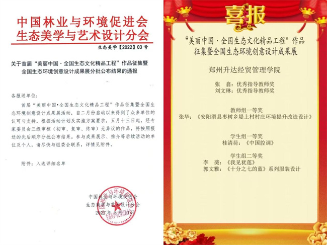 中新河南網(wǎng)7月21日電(張華 陳藝楠) 近日,在首屆“美麗中國·全國生態(tài)文化精品工程”作品征集暨全國生態(tài)環(huán)境創(chuàng)意設計成果展活動中,經(jīng)專家委員會審核,鄭州升達經(jīng)貿(mào)管理學院藝術學院教師張華獲得教師組一等獎,張翕、劉文琳獲得優(yōu)秀指導教師獎;桂清荷獲得學生組一等獎,李䶮、郭文雅分別獲得學生組二等獎。